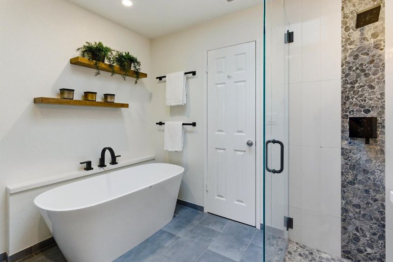 - Double Sinks, Half on Ground Floor, Marble, Oversized Tub, Shower and Tub, Tile