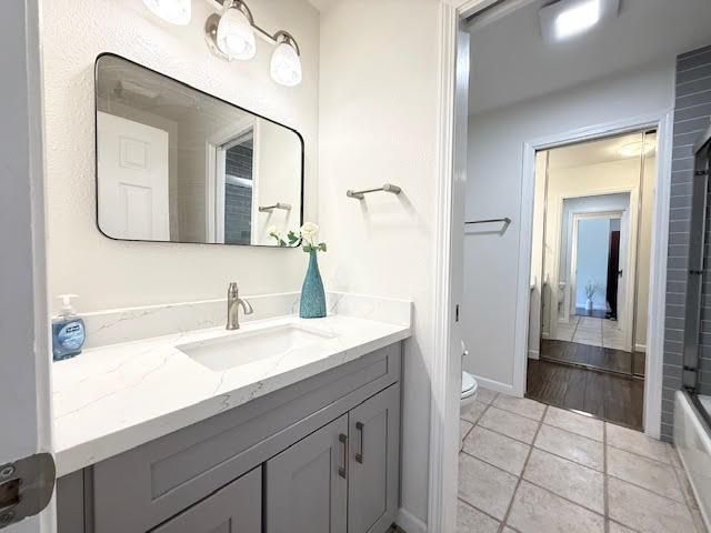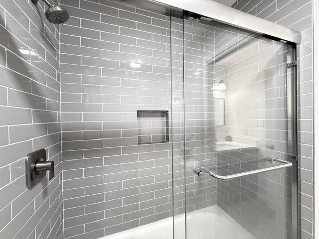 - Shower over Tub - 1, Stone, Tile, Tub in Primary Bedroom, Updated Bath