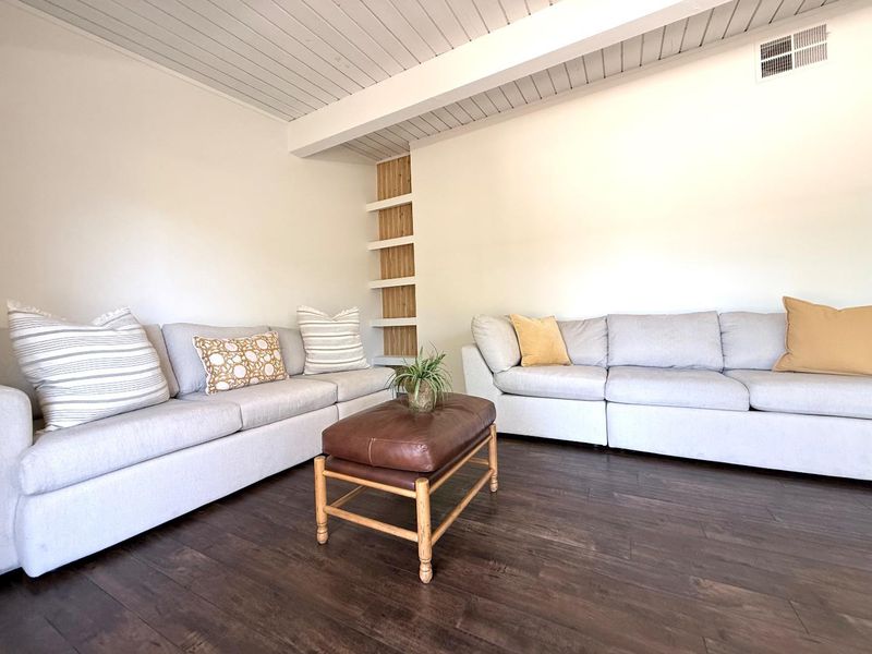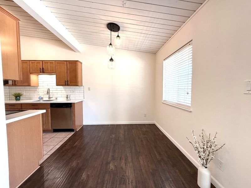 Welcome to this stunning 2 bedroom, 1.5 bath sweet home in Villa Vicente, where elegance meets comfort. Nestled in a serene Creekside setting, it offers a peaceful, nature-filled retreat, while close to the vibrant downtown Pleasanton with wonderful shops & restaurants. Sunlight pours through open picture dual paned windows & sliding door, illuminating gleaming laminate floors, spacious living rm/ dining are perfect for relaxing or entertaining. The spacious balcony w/ views of the hills creating a tranquil outdoor escape. This lovely kitchen features quartz countertops, modern cabinetry, a subway tile backsplash & stainless steel appliances. Vaulted ceiling's exposed wood details add warmth and character throughout. The primary bedroom offers comfort and privacy, complemented by a remodeled bath featuring a shower-over-tub, elegant subway tile surround & quartz countertop vanity. A shared half bath serves the second room, ideal for guests or office space. Central AC/ Heating ensure year-round comfort. Also boasting sparkling pool, covered parking, guest parking & a storage closet, top rated schools, famous Meadowlark Dairy, Alameda County Fairground, near transit, ACE train & 680. W/ its natural beauty, modern updates & inviting feel, this condo is truly a place to call home.