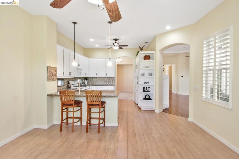 Discover the best of Summerset 3 living in this delightful home! A gated front courtyard and beautiful glass inlaid entry door create a warm, stylish welcome. The updated kitchen features slab granite counters, a striking tile backsplash, white cabinetry, and elegant pendant lighting over the bar seating area. Refrigerator included. Interior design & décor highlights include two bay windows, a two way gas fireplace, arched doorways, plantation shutters, mirrored closet doors, custom paint, six ceiling fan/light fixtures, crown moulding, a Phantom screen door, vertical blinds, laminate flooring, brand new carpet & more. The double door den offers great versatility—ideal as an office, hobby room, or potential third bedroom. Imagine relaxing or entertaining in the private backyard with a covered patio, two small lawn areas, tall hedges, and many colorful rose bushes. The laundry room includes a sink, cabinetry, and washer & dryer. An oversized two car garage adds convenience with built in shelving and a pull down ladder to a spacious storage loft. Enjoy the Summerset golf course community lifestyle with gated entrances, a large clubhouse, pool and spa, billiards, library, fitness center, bocce, tennis, and more. Join community events or simply relax and enjoy life at your own pace.