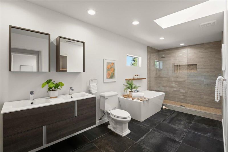 - Double Sinks, Full on Ground Floor, Half on Ground Floor, Primary - Stall Shower(s), Skylight, Stall Shower - 2+, Tile, Tub in Primary Bedroom, Tubs - 2+, Updated Bath