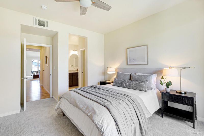 Beautifully designed contemporary condo offering a true urban living experience in the heart of downtown Petaluma, just moments from the Theatre District and riverfront. This light-filled home features two bedrooms, two and a half bathrooms, and an attached one car garage equipped with a NEMA 14-50 outlet for EV charging. With a well-appointed, contemporary layout, the open concept living space showcases clean lines, modern finishes, and a loft like feel with abundant natural light throughout. The seamless flow between the kitchen and living area creates an ideal setting for both everyday living and entertaining. Three balconies provide inviting outdoor spaces to relax and take in city and mountain views. Enjoy the convenience of being just steps from downtown restaurants, shops, galleries, and riverfront pathways. Perfect for those seeking a vibrant, low maintenance lifestyle in one of Petaluma's most desirable locations.