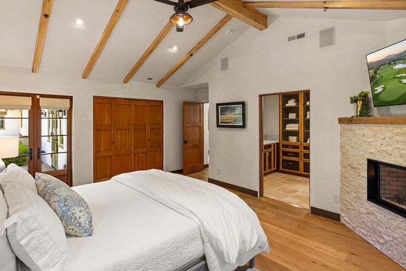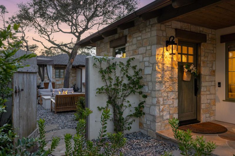 Refined coastal living in the heart of Carmel. Built in 2020 and set behind a charming gated entry, this single-level home offers privacy, lush landscaping, and seamless indoor-outdoor living. Natural stone accents, vaulted beam ceilings, and wide-plank aged oak hardwood floors create a warm, light-filled interior. The living room features a striking stone fireplace and flows into the dining area and chef's kitchen with white cabinetry, stone countertops, and high-end appliances. Blending European cottage charm with modern comfort, the home includes whole-house audio and smart features. A luxurious primary suite with vaulted ceilings, a fireplace, and a spa-like bath with soaking tub, glass shower, and travertine finishes, along with radiant heated floors. Each bedroom features its own en-suite bathroom and French doors that open to outdoor sitting areas. From the dining area and hallway, doors open to a private courtyard with a fire pit and serene garden spaces, ideal for relaxing or entertaining. Moments from Carmel's beaches, fine dining, renowned shops, and art galleries. Elegant, private, and perfectly placed, this is Carmel living at its most intentional.